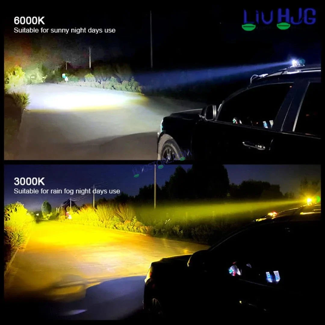 The dual‑colour mode means you can switch to yellow for fog/dust (better penetration) and revert to white for clear visibility.